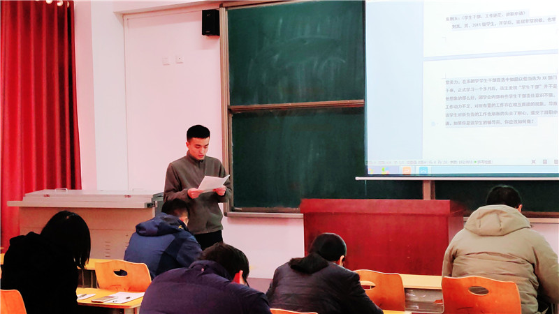为迎接学校辅导员职业能力大赛的最终决赛,贯彻学校对辅导员队伍的素质培养和提升的政策。yl6809永利官网集团于2018年11月21日在21号教学楼311教室举行辅导员主题班会比赛。此次比赛由yl6809永利官网集团学管院长王桂伟、处长助理栗新燕、学管科长马安会和学管干事李宁担任评委。