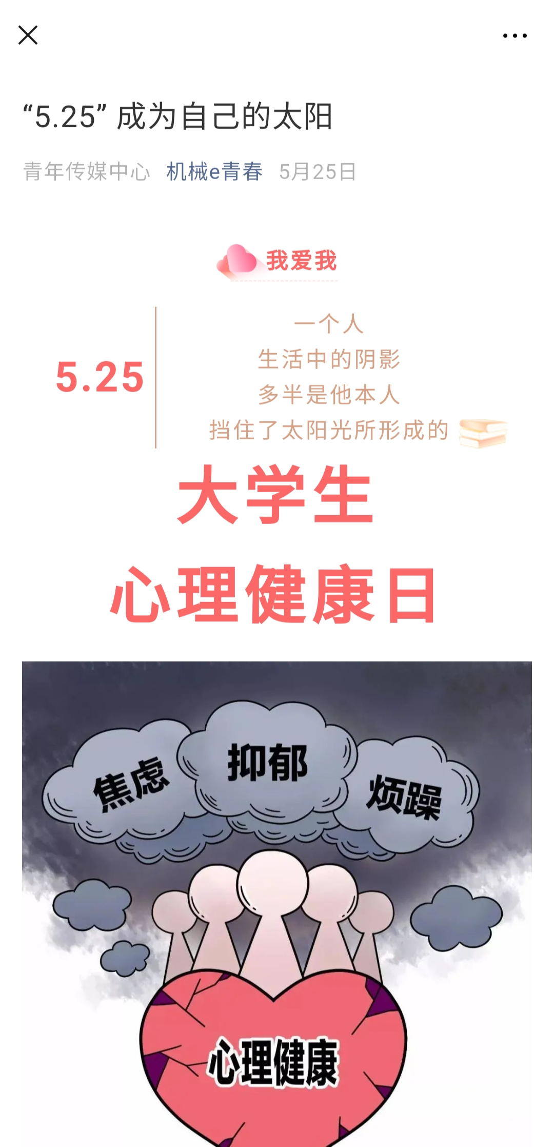心理小百科推送依托“机械e青春”公众号开展,推送了1篇心理文章。