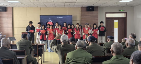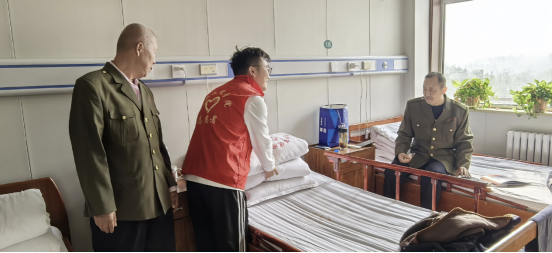 活动现场暖意融融,志愿者们分工明确、行动有序。整理内务环节中,叠军被称为核心亮点。志愿者们提前做足功课,认真学习军被折叠的规范要领,一步步将松散的被子打造成 “豆腐块”。过程中,有老兵坐在一旁静静观看,偶尔起身示范指导,现场其乐融融。随后,志愿者们围坐在老兵身边,与他们促膝长谈。耐心倾听老兵们讲述往昔军旅岁月里的战斗故事、峥嵘历程,偶尔轻声回应、细细询问,现场氛围亲切而热烈。聊到动情处,有志愿者提议用歌声向老兵致敬,立刻得到全员响应。志愿者们以饱满的热情唱响《我爱你中国》,激昂的旋律回荡在病房里,老兵们也跟着节奏轻轻哼唱,眼神中满是坚定与动容。