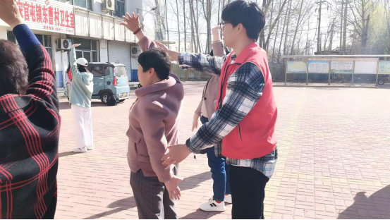 活动过程中,志愿者对社区居民进行了八段锦教学,将积极健康的生活理念传递给每一位社区居民。从起势到收势,每个动作都耐心讲解、细致指导,在交流互动中,与居民们建立起深厚的情谊。居民们热情高涨,尽管起初动作有些生疏,但在志愿者的帮助下,逐渐掌握了八段锦的基本要领,眼神中满是热情与喜悦。