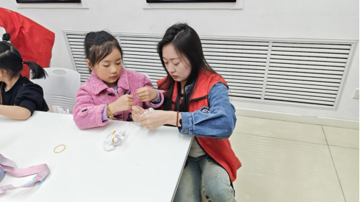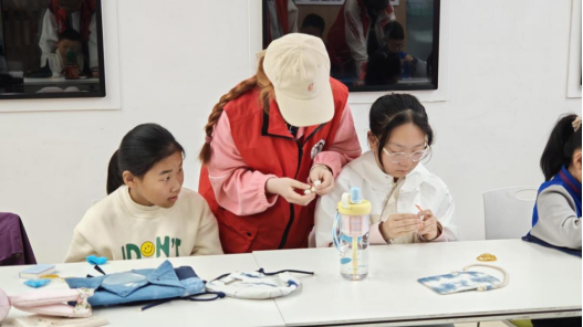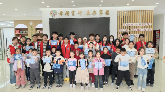 活动中,学生志愿者们用生动的语言和直观的图片,向孩子们介绍蓝染的历史、工艺和文化价值,从植物提取到扎染技艺再到图案设计,孩子们听得津津有味。在实践环节,孩子们亲手体验了扎染方巾的制作,看着白布在蓝靛中浸染后展开的独特花纹,他们兴奋地欢呼:“原来非遗这么有趣!”
