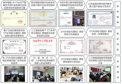 课题研究:依托汽车保险与理赔课程,完成了校级课题基于主线式案例教学的《汽车保险与理赔》课程信息化教学改革研究,并以此课题研究参加2024年度山东省汽车维修与检测行业科学技术奖评选获教学成果奖特等奖、开展了人工智能背景下《汽车保险与理赔》课程数字化教学改革与实践的课题研究。 课程建设:进行2021—2022学年第二学期课堂教学改革试点课程建设验收合格,建设研究形成的《汽车保险与理赔》课程教学模式入选2023年课程教学模式集锦,并于2024年完成课程教学改革示范课的建设;完成汽车保险与理赔课程思政示范课建设。 参加比赛:以《汽车保险与理赔》课程,2024年参加第五届“匠心筑梦 领航未来”全国高校教师技能创新大赛获一等奖、参加第六届全国高校混合式教学设计创新大赛获三等奖、参加第十届全国应用型人才综合技能大赛,获得了“园丁情”教师创课大赛三等奖、2020年参加学校首届课程思政教学比赛获得二等奖、参加2021年青年教师信息化教学比赛获得二等奖、参加yl6809永利官网集团青年教师比赛获得二等奖、参加yl6809永利官网集团说课比赛获得三等奖。 典型案例:获得山东华宇工学院2022年春季学期首批线上教学优秀基层教学组织和典型教学案例一等奖;2023年,课程思政案例“用爱来创造 用保险来守护”被选为山东华宇工学院校级课程思政典型案例;汽车保险与理赔-汽车保险综合案例参加校级优秀教学设计比赛获得二等奖,并入选2023年优秀教学设计汇编;依托《汽车保险与理赔》课程参与知识图谱和AI助教功能试用研究,并撰写了“人工智能赋能教育教学”典型案例。 |