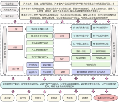为深入贯彻落实党的十九大精神,办好网络教育,积极推进“互联网+教育”发展,加快教育现代化和教育强国建设,2018年3月,教育部研究制定了《教育信息化2.0行动计划》,强调强调以教育信息化全面推动教育现代化,着力构建“互联网 + 教育”新生态,实现教育高质量发展与人才培养模式创新。汽车保险与理赔课程依托课题基于主线式案例教学的《汽车保险与理赔》课程信息化教学改革研究,遵循OBE教育理念,围绕汽车保险与理赔课程教学中“如何培养应用型人才、如何让课堂活起来、如何实现岗位零对接”等难题,提出了“一案四驱四位一体”课程设计理念,“六步五化一融合”的教学模式(如图1),即通过 “一案四驱四位一体”课程设计理念构建教学框架,以典型案例串联课程内容,借助线上线下资源、双轨联动教学设计、人工智能赋能教学、课内外联动四大驱动力,打破教学时空界限,实现知识传授与能力培养的深度融合;依托 “六步五化一融合”教学模式,以“问、查、导、析、汇、释”六个教学步骤引导学生主动探究,运用“过程一体化、手段信息化”确保教学连贯性与高效性,通过“方法多样化、考核多元化”激发学习兴趣与创新思维,以“内容岗位化”对接行业需求,同时融入时事热点与思政元素,将专业教育与价值引领有机结合,最终实现学生专业技能熟练应用、综合职业能力显著提升、行业认同感与责任感深度升华,达成知识、能力、素养协同发展的多元化育人目标。